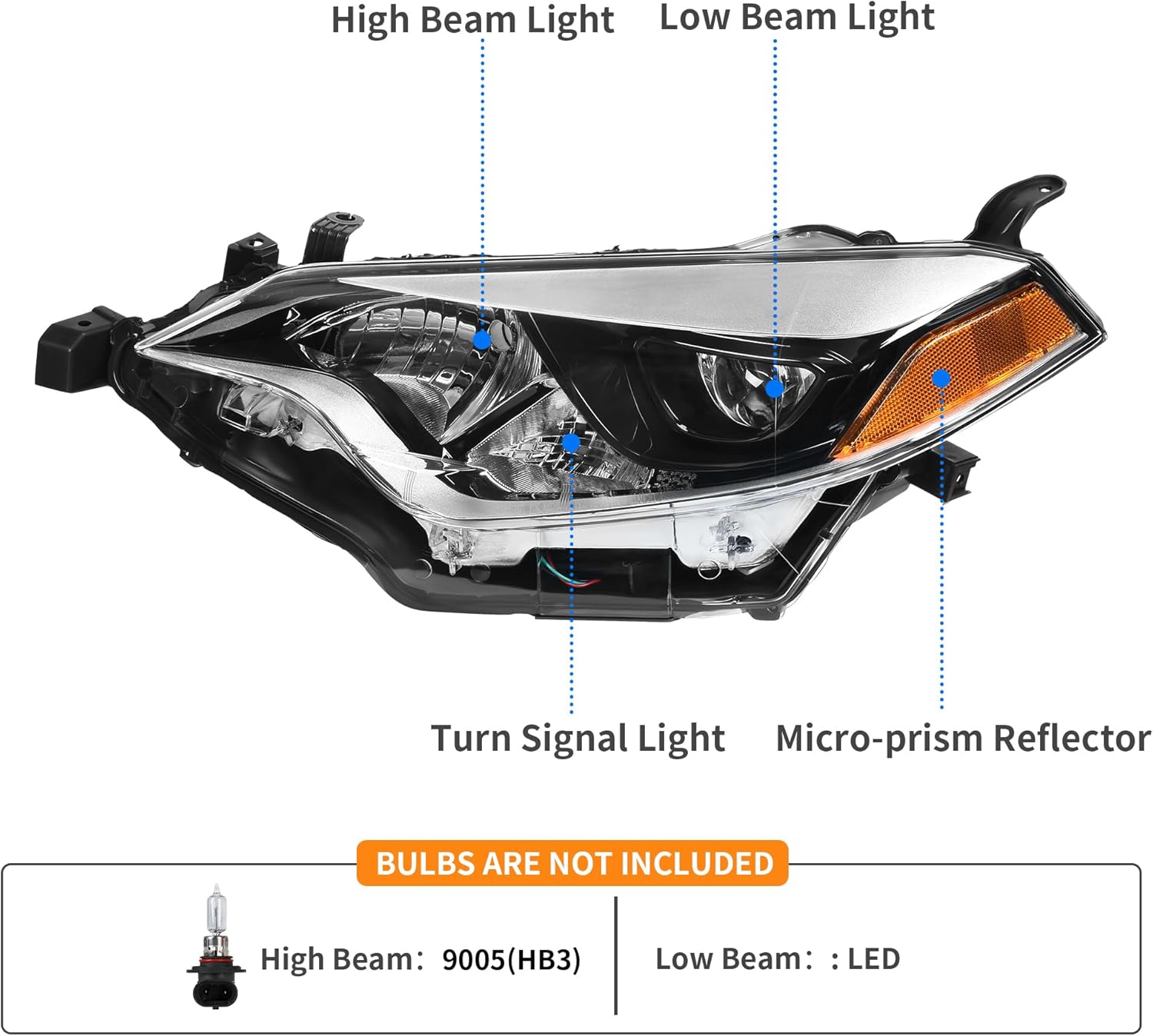 - Compatibility: the headlight assemblies are compatible with 2014 2015 2016 Corolla Base/CE/C/LE Eco/LE/L/S Plus/S/Special Edition Sedan 4-Door. High beam bulb type: 9005; Low beam bulb type: LED. Bulbs are not included. OEM Part Number: 81150-02E60, 81110-02E60